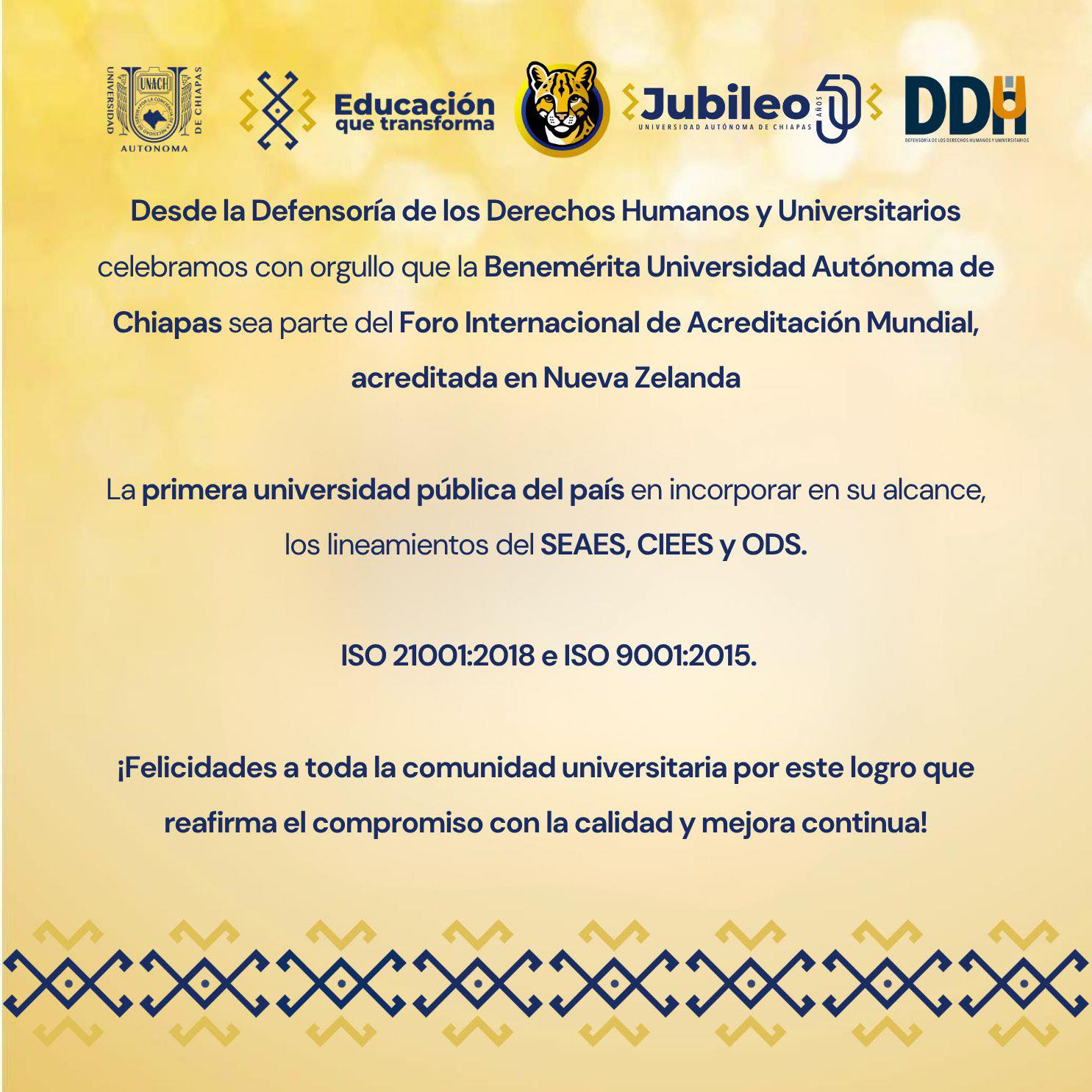 La DDHU felicita la Benemérita Universidad Autónoma de Chiapas por ser parte del Foro Internacional de Acreditación Mundial.