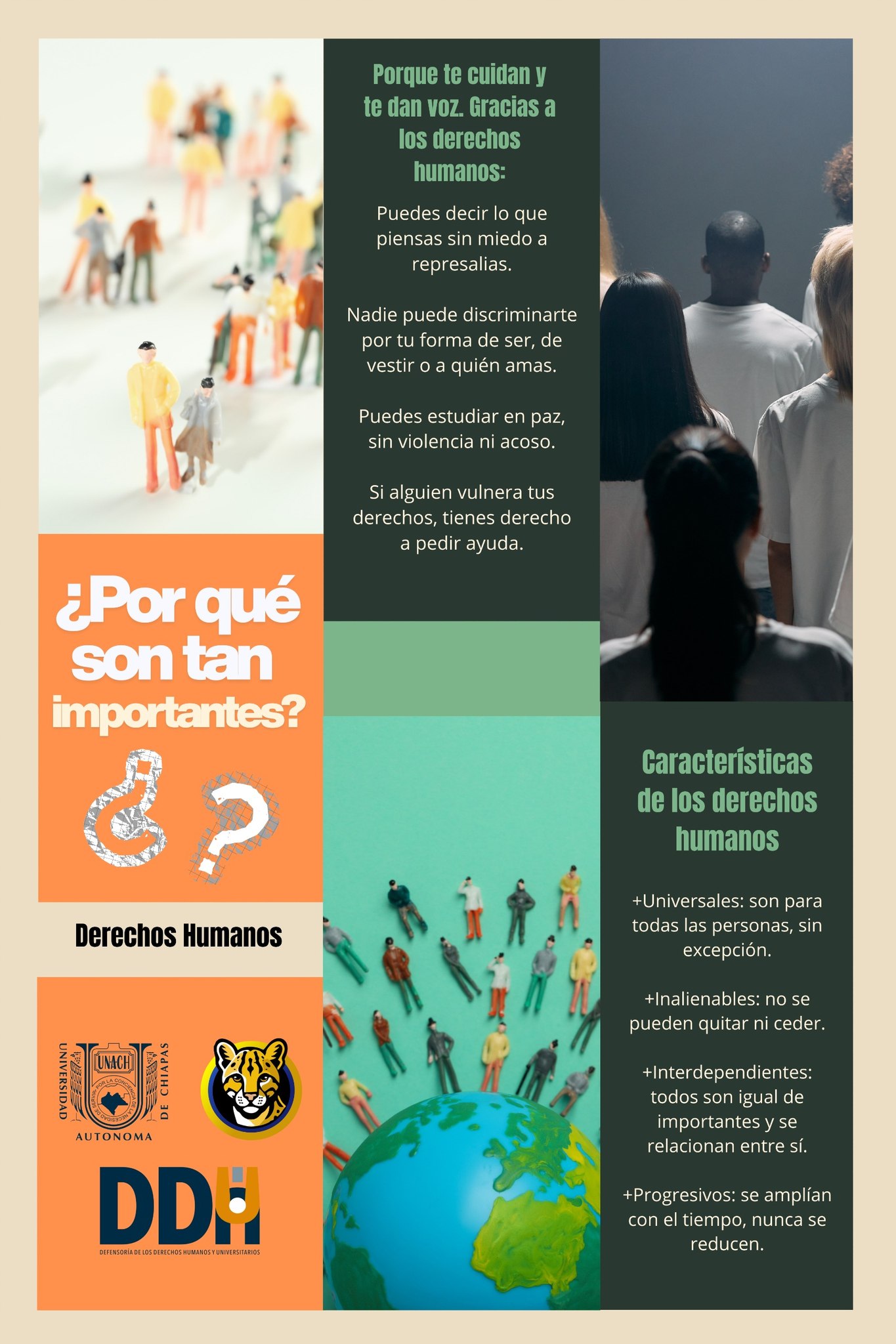 Los derechos humanos son importantes porque nos cuidan y nos dan voz. En la universidad, gracias a ellos puedes ser tú misma, tú mismo, tú misme: estudiar sin miedo, expresarte con libertad y convivir en igualdad.