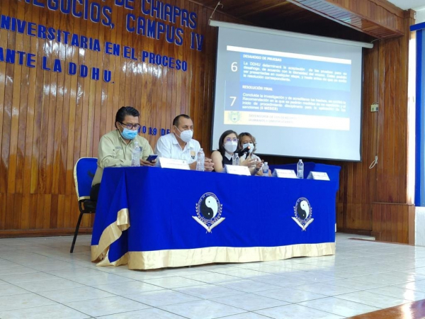 Acompañada por el Dr. Gilibaldo Hernández Cruz, Director de la Facultad de Negocios C-IV, y teniendo como sede el Auditorio de esa Facultad, la Directora de la DDHU desarrolló esta actividad con la intención de fomentar espacios de diálogo entre la Defensoría y personal directivo, así como dar a conocer las facultades y responsabilidades establecidas en la Legislación Universitaria.